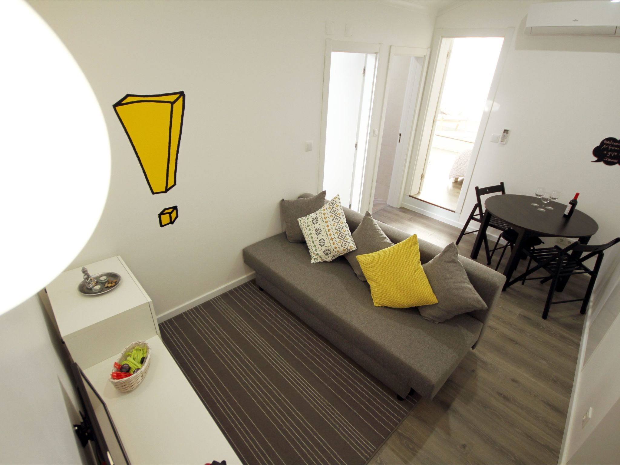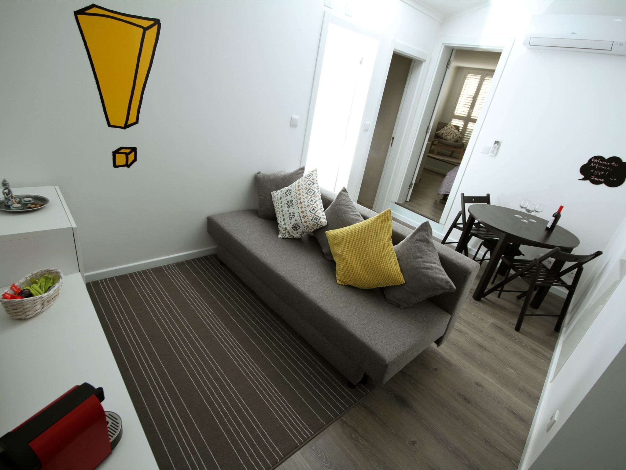 The apartment has a large living room with sofa bed, tv, coffee machine, bathroom with hairdryer and towels, kitchen and bedroom with double bed. Air Condition. Excelent wi-fi free. Very nice and comfortable. Welcome drinks. It is a warm and friendly space for you to enjoy!